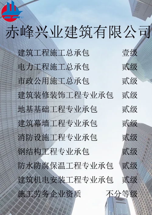赤峰興業(yè)建筑有限公司簡介 赤峰興業(yè)建筑有限公司成立于1998年7月,位于內(nèi)蒙古赤峰市松山區(qū)?,F(xiàn)已發(fā)展成為擁有建筑工程施工總承包壹級、電力工程施工總承包貳級、市政公用工程施工總承包貳級、承裝、修、試四級、?建筑裝修裝飾工程專業(yè)承包貳級、建筑幕墻工程專業(yè)承包貳級、消防設施工程專業(yè)承包貳級、地基基礎工程專業(yè)承包貳級、鋼結構工程專業(yè)承包貳級、建筑機電工程專業(yè)承包二級、防水防腐保溫工程專業(yè)承包貳級以及建筑施工勞務等資質(zhì)的綜合性建筑施工企...
